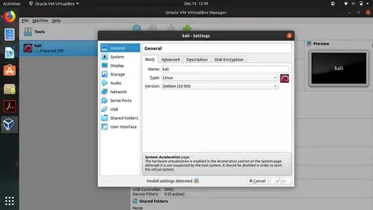 As you can see in the above screenshot, there are some invalid settings. (System Acceleration page: The hardware virtualization is enabled in the Acceleration section of the System page although it is not supported by the host system. It should be disabled in order to start the virtual system).