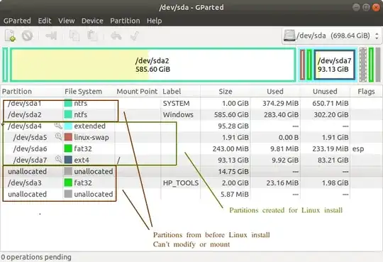 - I can see partitions in GParted, but I can't mount or modify any of the non-Linux partitions (/dev/sda1, sda2, sda3). I do see an option to format the Windows partition.