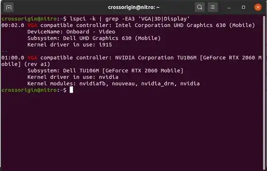 lspci -k | grep -EA3 'VGA|3D|Display'terminal command. – Pilot6 May 06 '20 at 15:02sudo apt purge nvidia*then checkubuntu-drivers deviceto see which driver is the recomended one and try to install it or install withsudo ubuntu-drivers autoinstall- it will install all the recomended ones. reboot after delete is needed. – Iván Prokópov May 06 '20 at 17:29