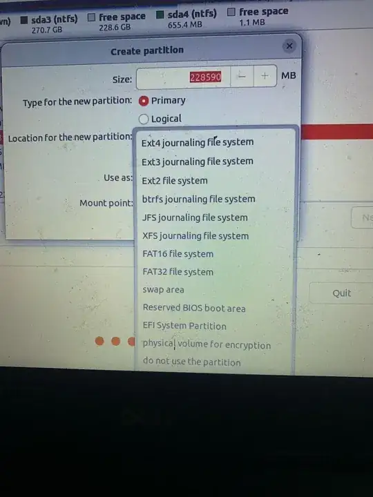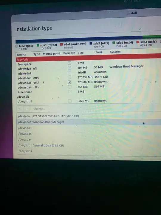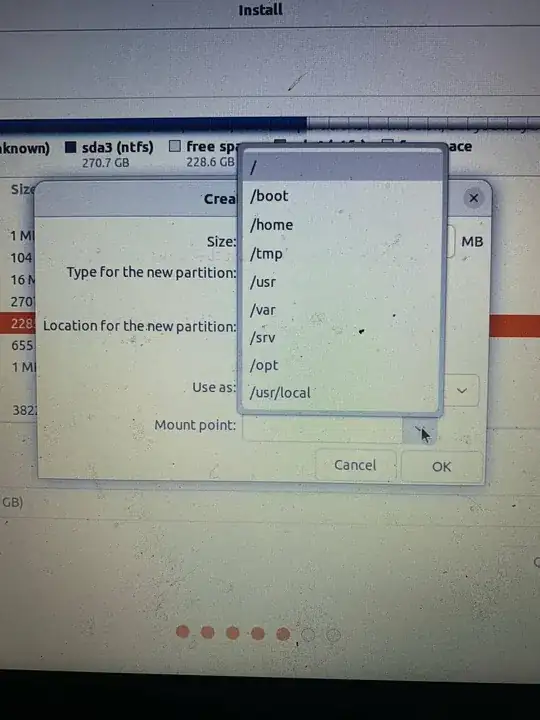 I am currently installing Ubuntu Desktop on my Windows 11 machine (dual-boot, not replacing Windows OS). I partitioned my disk in half so that half of it is for my Windows OS and the other half is free space which I can use now for Ubuntu. I am following a YouTube tutorial and am at the part where I choose my "Use as:", "mount point", and "Device for boat loader installation.