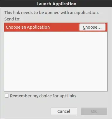 apturlpackage (sudo apt-get install apturl). What type of file or link are you trying to open? – kiri Oct 18 '13 at 23:29apt-urlis already the latest version – kelvinelove Oct 18 '13 at 23:46Ubuntu Software Centerwhen you click on it – kelvinelove Oct 18 '13 at 23:49