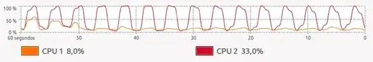 As you can see in the picture the CPU usage varies in a sort of waveform, getting 100 % load pikes each few seconds.