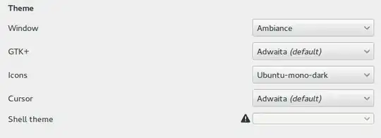 Hovering over the exclamation mark shows the following tool-tip: Shell user-theme extension not enabled. I'm using Ubuntu 14.10, and have installed gnome-shell-extensions.
