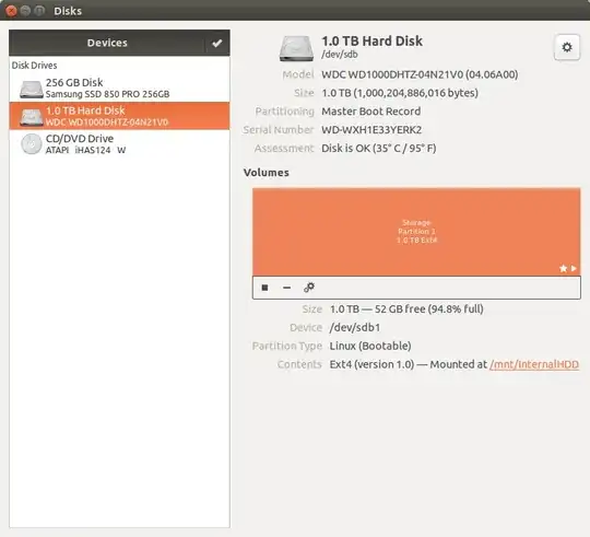 So I start the Disks utility to have a look, and the Disks utility reports that my disk "InternalHDD" has 52 GB free.