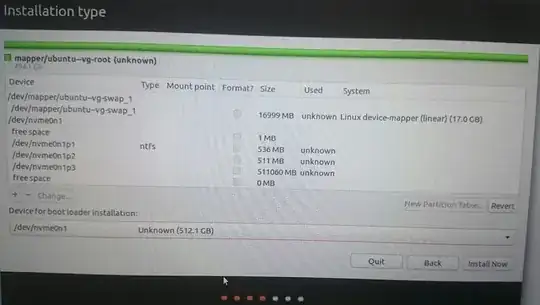 Then there were 2 options (go back or continue to UEFI mode). I clicked continue to UEFI. Then I chose Something else. After that I accidentally clicked on "revert". After I clicked the bar on the top turned green and things look like this.